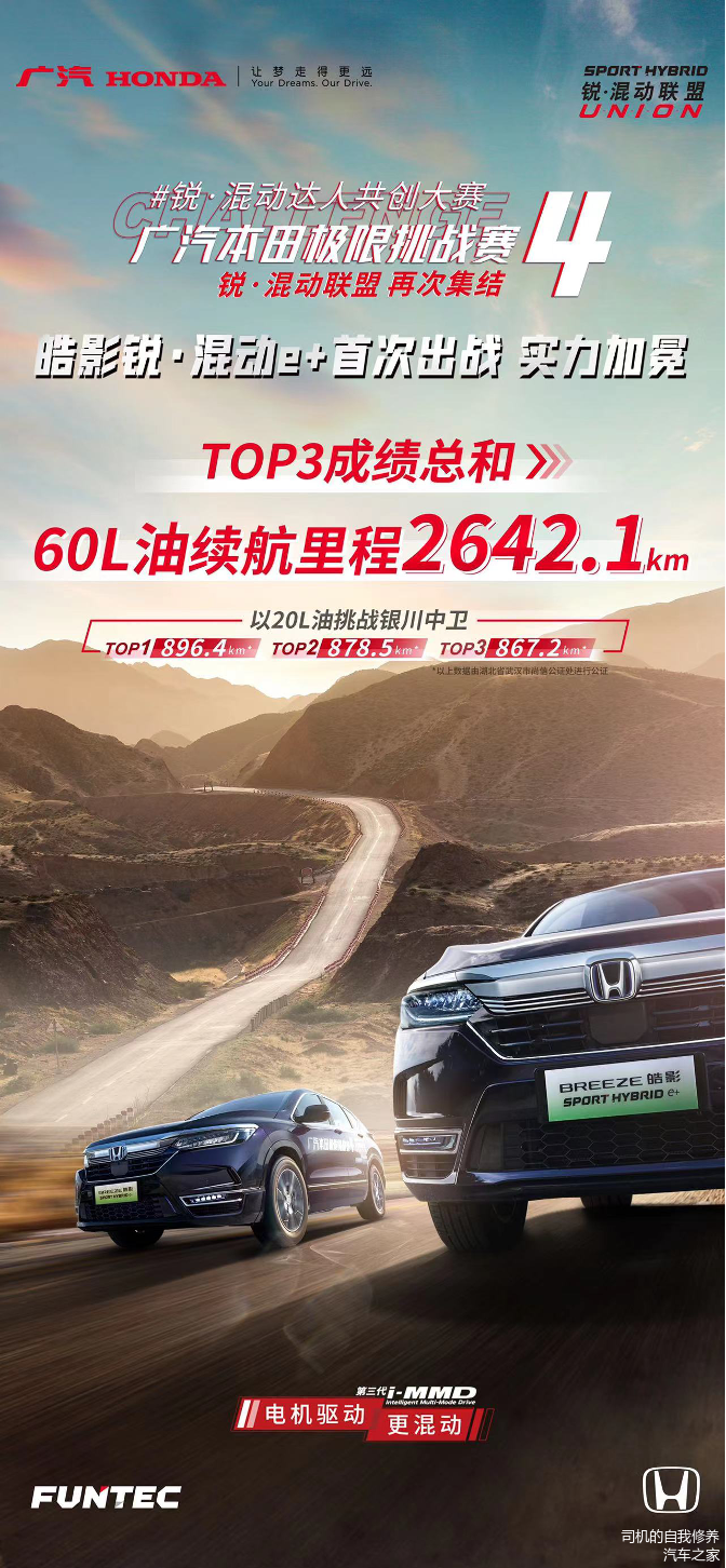 随着皓影锐··混动e+车型抵达终点,锐·混动e+系统的首次极限挑战圆满完成。冠军选手使用20升汽油行驶了896.4公里,亚军成绩是878.5公里,第三名也有867.2公里的优异成绩。前三名队伍总成绩折合60L汽油合计行驶2642.1公里,前三名队伍的成绩都非常接近,并非某一位成绩特别高,平均都能达到860公里以上的长的续航,广汽本田用实力证明了基于第三代i-MMD系统的插电式混动车型是真正高效、节能的。正是这种在极限状态下不断突破的精神,贯穿了自2017年以来的每一届广汽本田极限挑战赛。